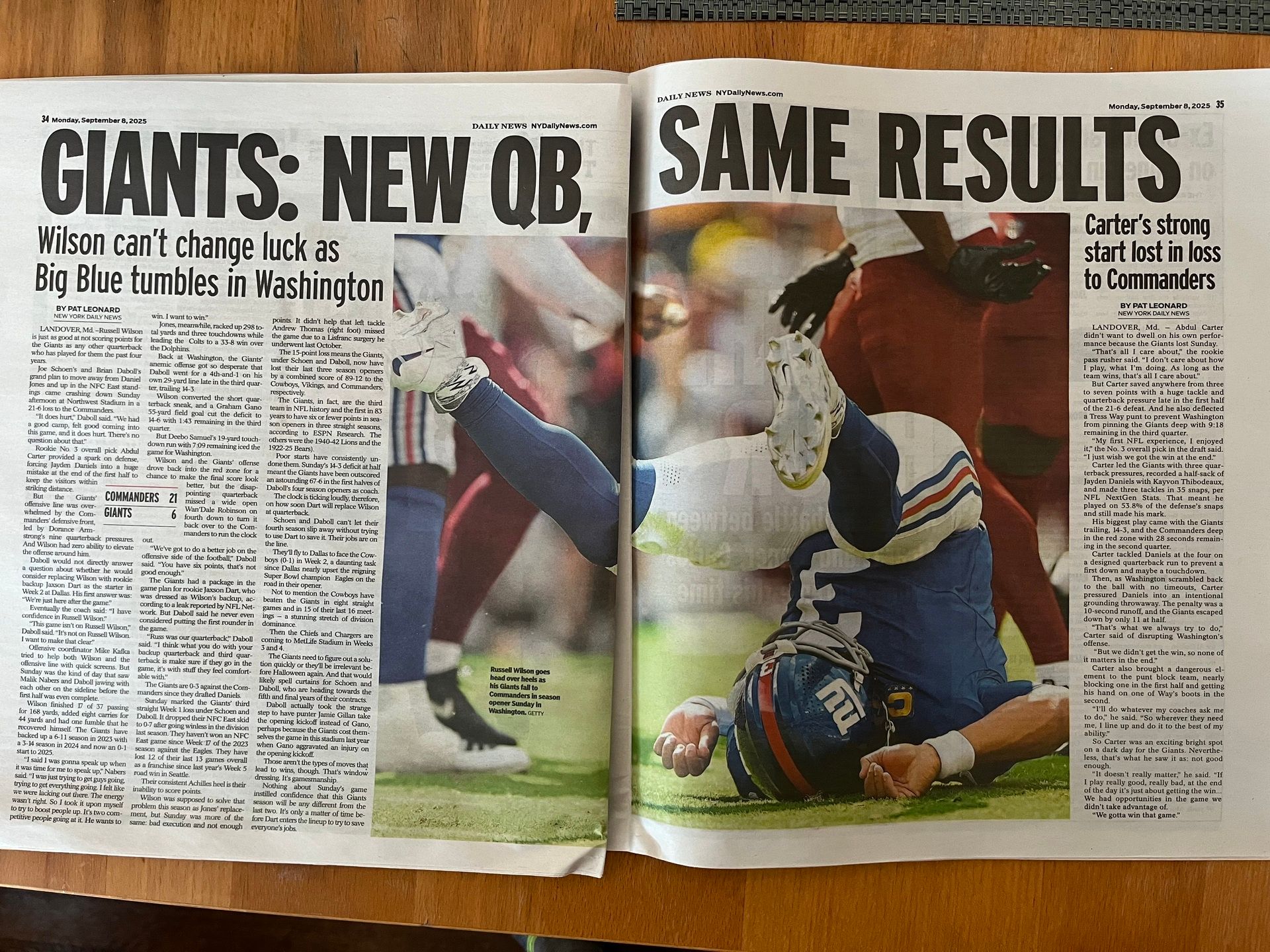 “Well, we’re talking about after every game,” Daboll said. “I’ve got confidence in Russ. We’re going to go back, we’ll evaluate the tape. This game is not on Russell Wilson. It's not on Russell Wilson. Let me make that clear. I have confidence in Russ. We have to do a better job all the way around.”