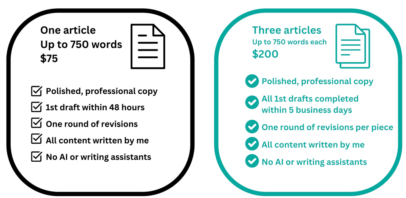 As a bonus, I’m going to give the first person who commissions work from me a discount: $50 for one article and $150 for three, and if there’s no line through the package, it means that no one has claimed that particular discount.