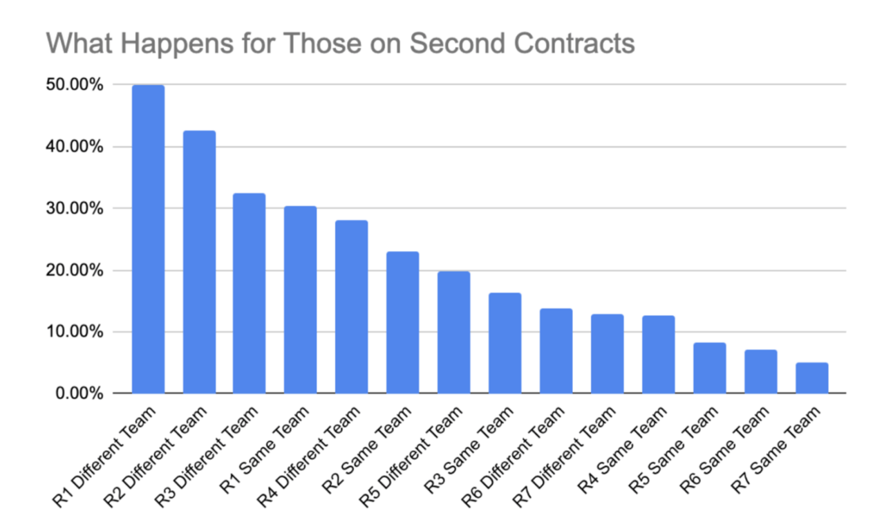Two years ago, they looked at how likely a player was to re-sign with the team that drafted him. The sample is the 2010 through 2017 drafts, and they delineated the results based on rounds. The results surprised me: