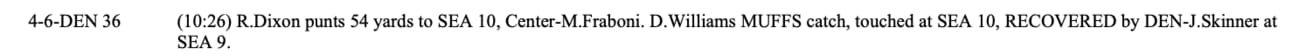 -14.21%, Dee Williams muffs punt at the Seattle 10 in the 2nd quarter