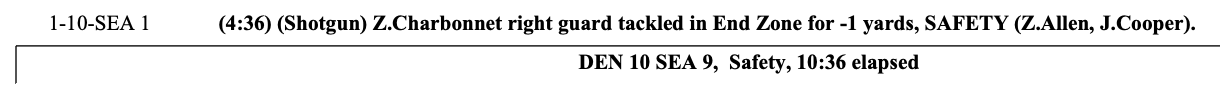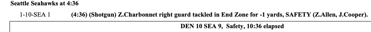 Allen grabbed Charbonnet, who managed to lean forward and get the ball to the goal line, but not out of it, resulting in Seattle’s second safety of the first half.