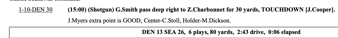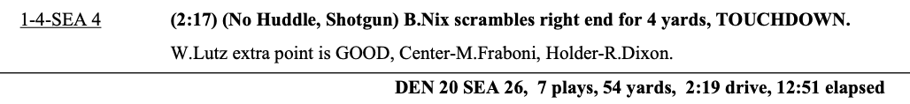 Score is Seattle 26, Denver 20